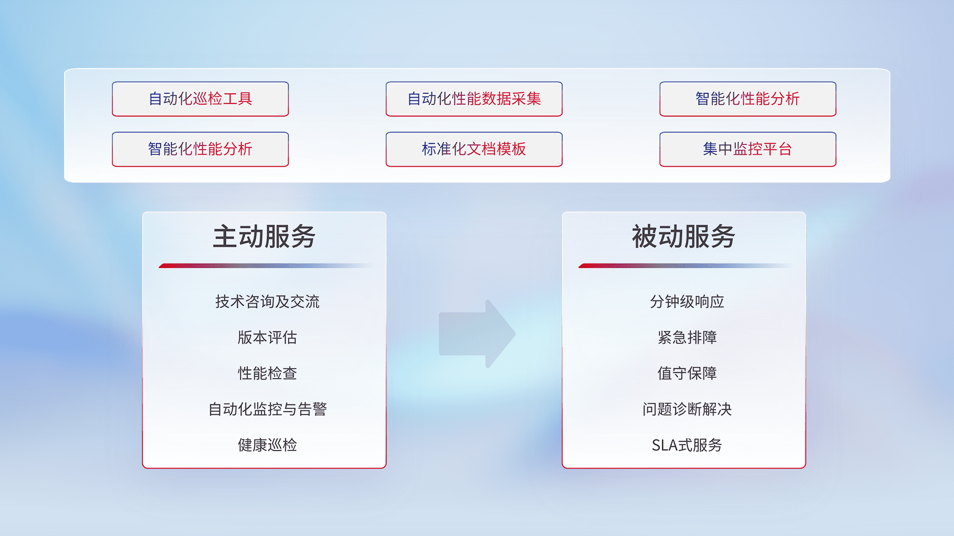 智能化工具和标准化文档,,,保障服务质量,,,,提供主动服务(包含技术咨询、、、、版本评估、、性能检查、、、、自动化监控与告警、、、健康巡检)和被动服务包含(分钟级响应、、、、紧急排障、、值守保障、、问题诊断解决、、SLA服务)。。